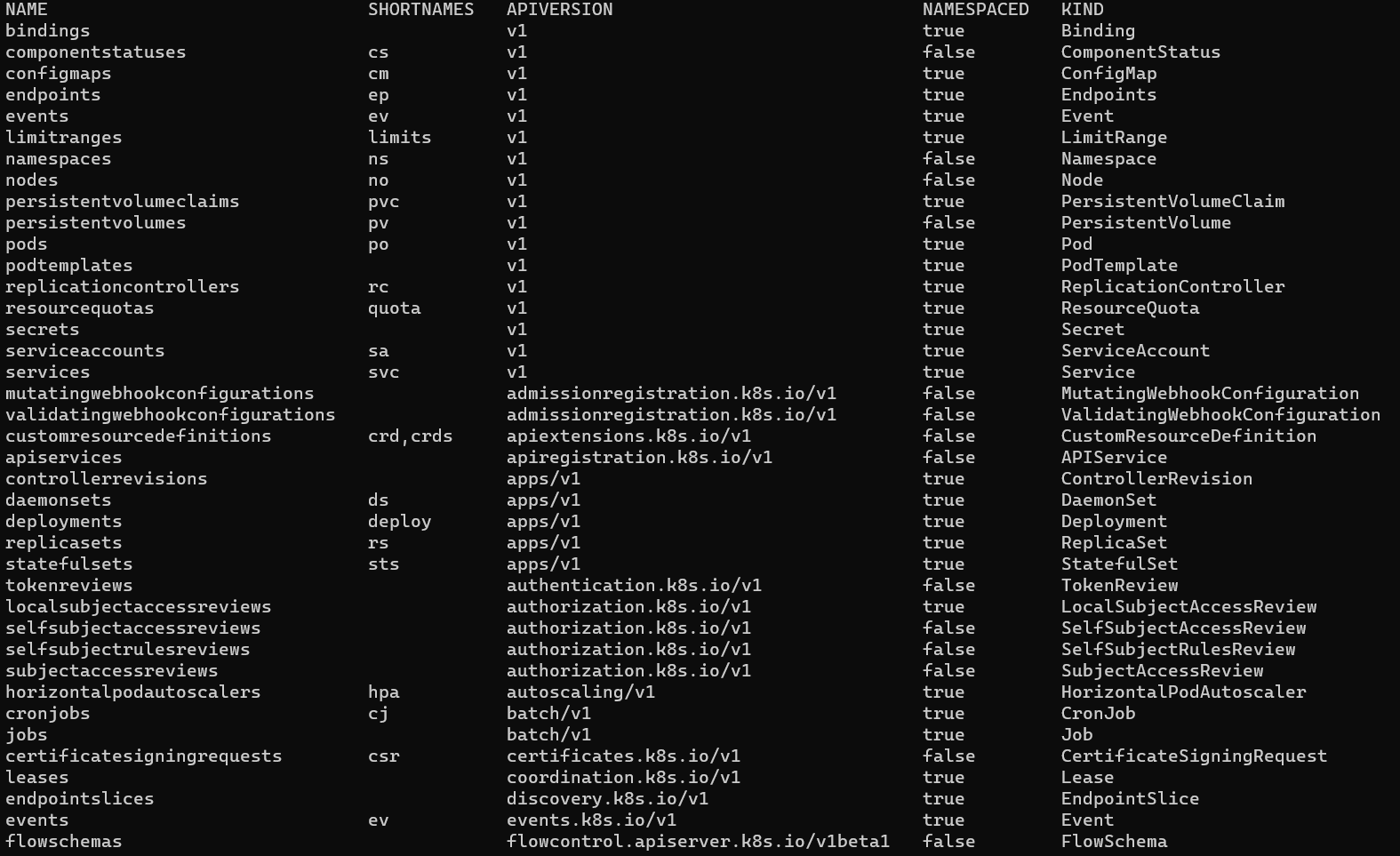 쿠버네티스의 오브젝트에는 어떤 것이 있는지 보려면 kubectl api-resources 명령어를 사용해 확인할 수 있다.