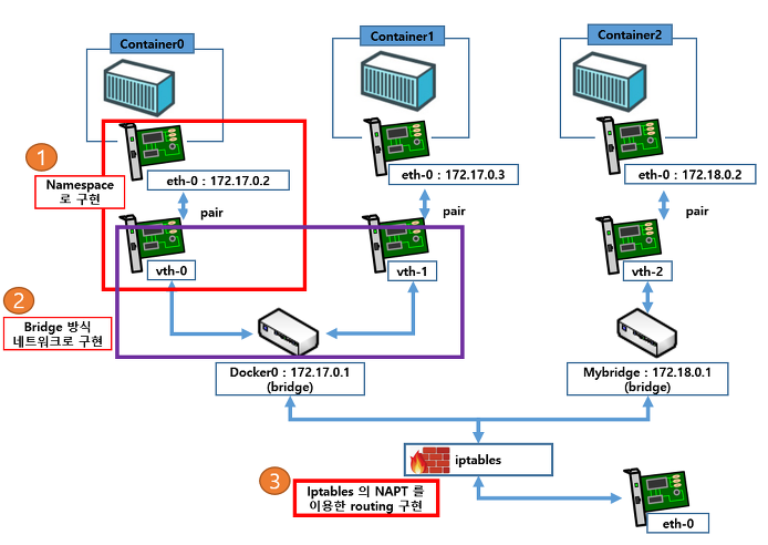 컨테이너의 eth0 인터페이스는 호스트의 veth ... 라는 인터페이스와 연결됐으면 veth 인터페이스는 docker0 브리지와 바인딩돼 외부와 통신할 수 있다.